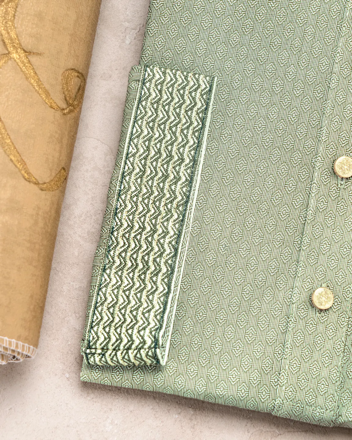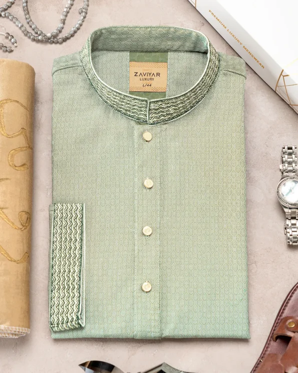 Product Description : Men’s Jacquard Cotton regular fit Panjabi For Eid. Band Collar. Collar band & sleeve has embroidery details. Decorative metal show button, long Sleeve, straight hem.