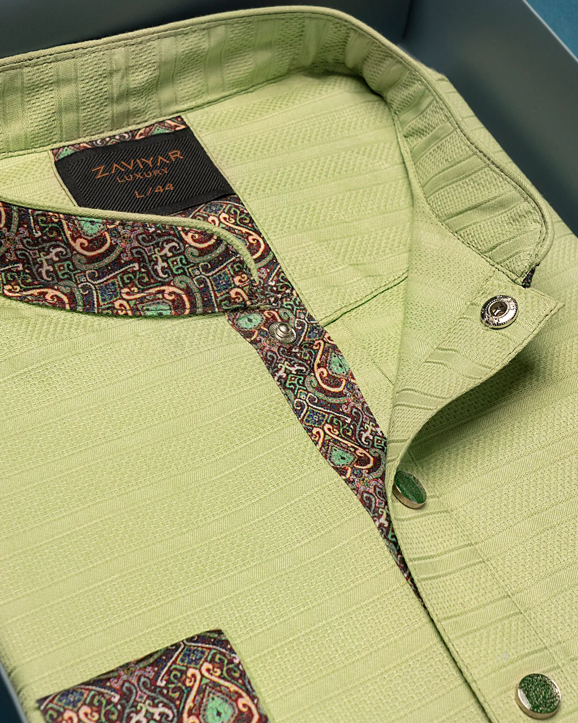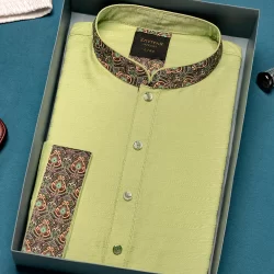 Men’s Cotton woven regular fit panjabi. Band Collar. Collar band, Body around the button plackets & sleeve hem embroidery. Decorative metal show button, long Sleeve, straight hem.