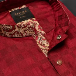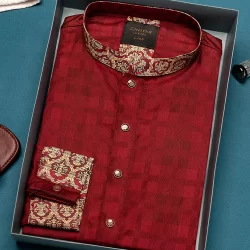Men’s Cotton woven regular fit panjabi. Band Collar. Collar band, Body around the button plackets & sleeve hem embroidery. Decorative metal show button, long Sleeve, straight hem.