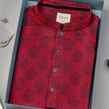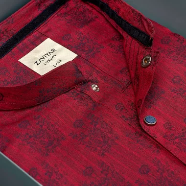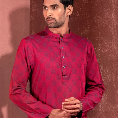 Men’s Jacquard Cotton regular fit panjabi. Band Collar. Band inside decorative tape details button placket has decorative tap & Button. Moon has cut & sew design. Long Sleeve. straight hem.