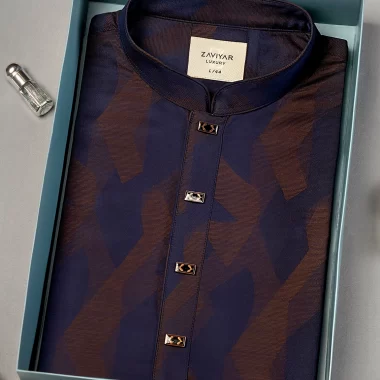 Men’s Fancy Cotton regular fit panjabi. Band collar. Collar band Embroidery, Contrast inner placket. Moon has cut & sew contrast design. Long Sleeve contrast piping, straight hem.
