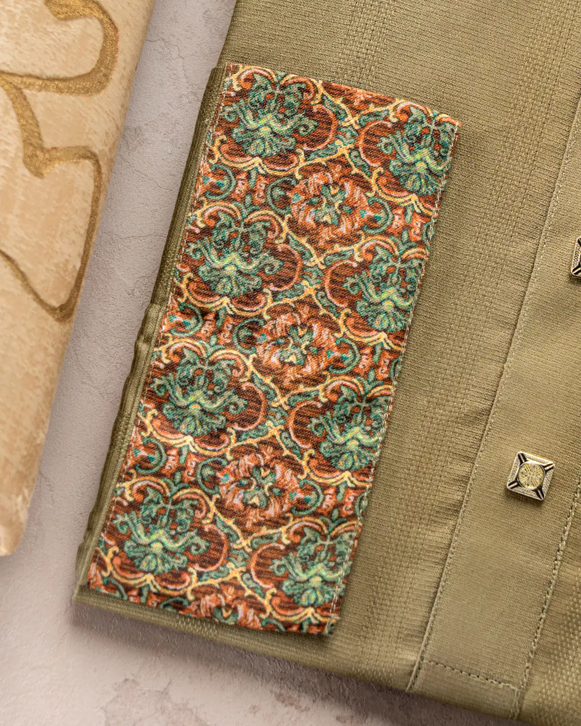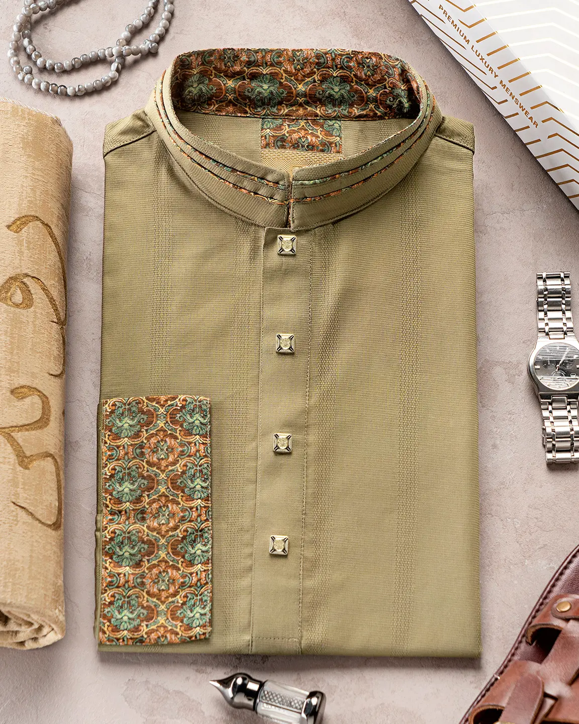 Product Description : Men’s regular fit panjabi with a premium band collar. The front placket is neatly detailed and finished with decorative metal buttons. Matching cuffs with refined trimming for a clean, coordinated look.