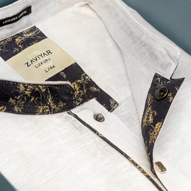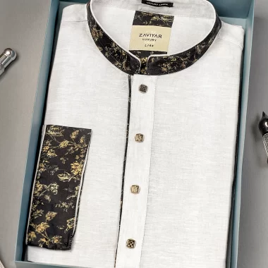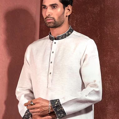 Men’s Luxury Linen regular fit panjabi. Band collar. Collar band with contrast details, Contrast inner placket piping. Moon has cut & sew contrast design. sleeve hem with contrast on folding cuff. Back yoke with contrast loop, Long Sleeve, straight hem.