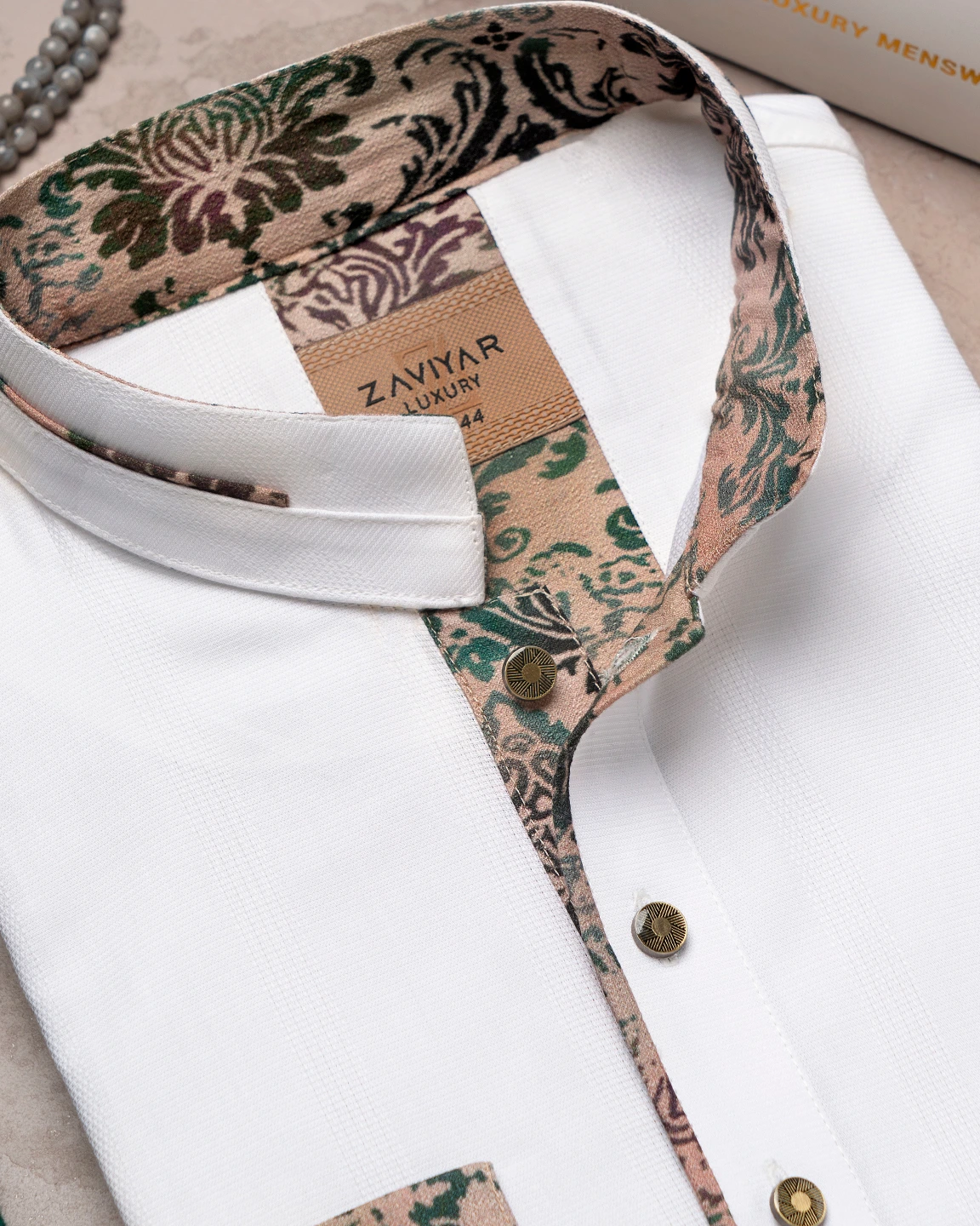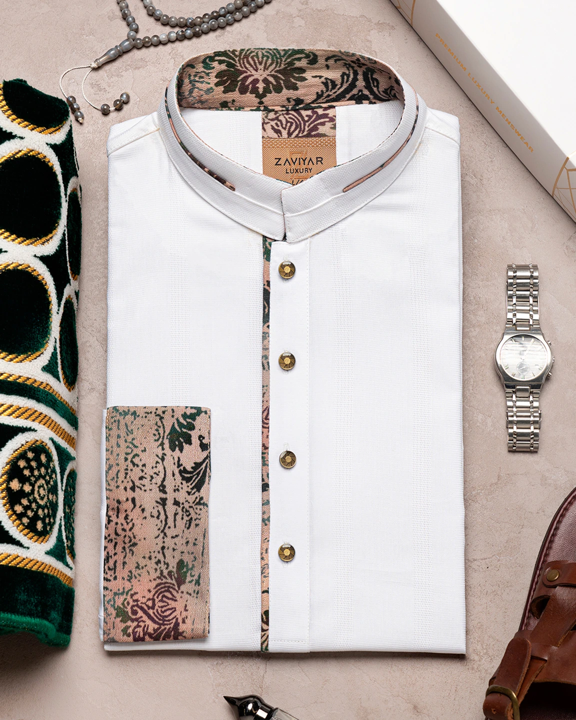 Product Description : Men’s Fancy Cotton regular fit panjabi For Eid. Band Collar. Collar band & sleeve has contrast details. Decorative metal show button, long Sleeve, straight hem.