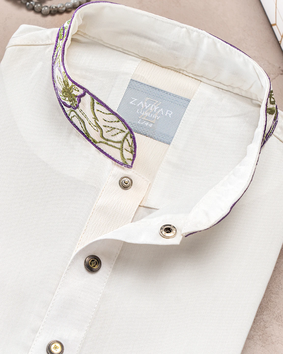 Product Description : Men’s Viscose regular fit Panjabi For Eid. Band Collar. Collar band & sleeve has embroidery details. Decorative metal show button, long Sleeve, straight hem.