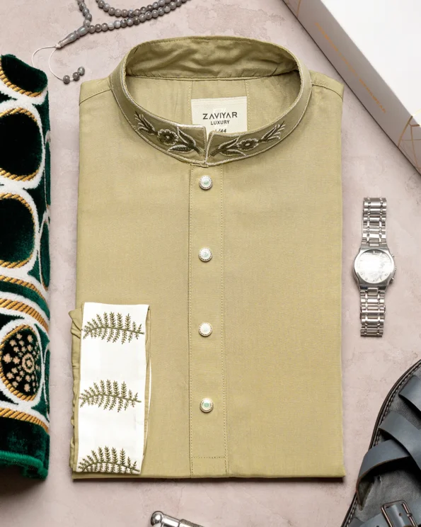 Product Description : Men’s Viscose regular fit Panjabi For Eid. Band Collar. Collar band & sleeve has embroidery details. Decorative metal show button, long Sleeve, straight hem.