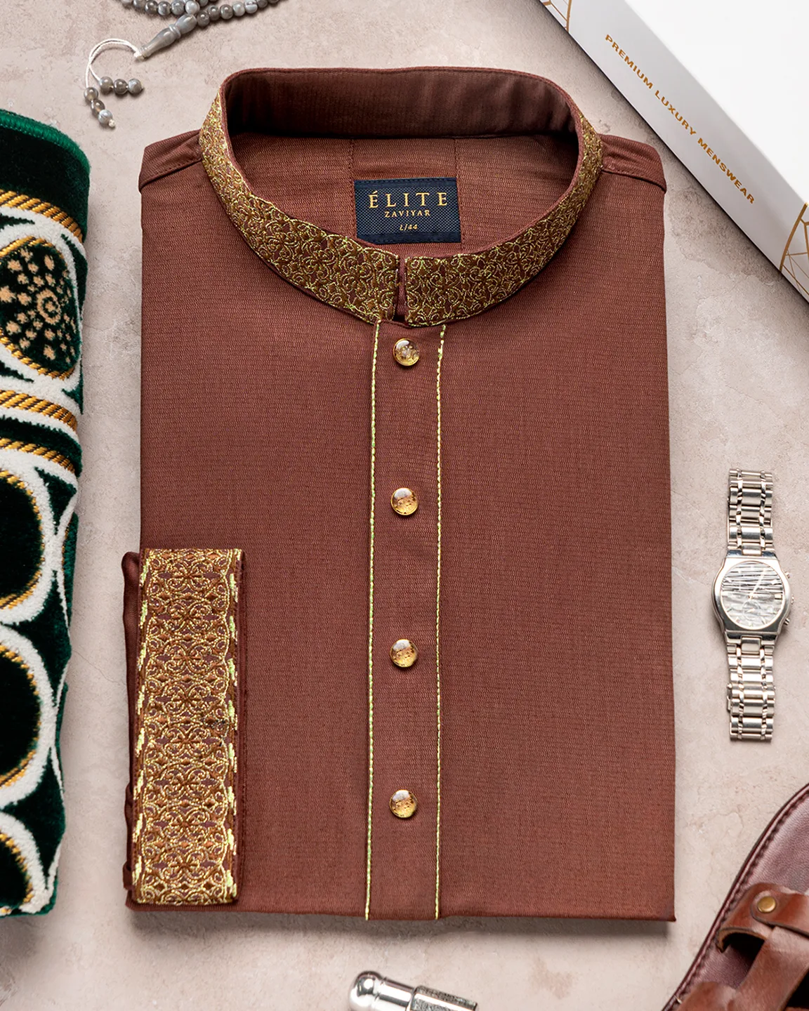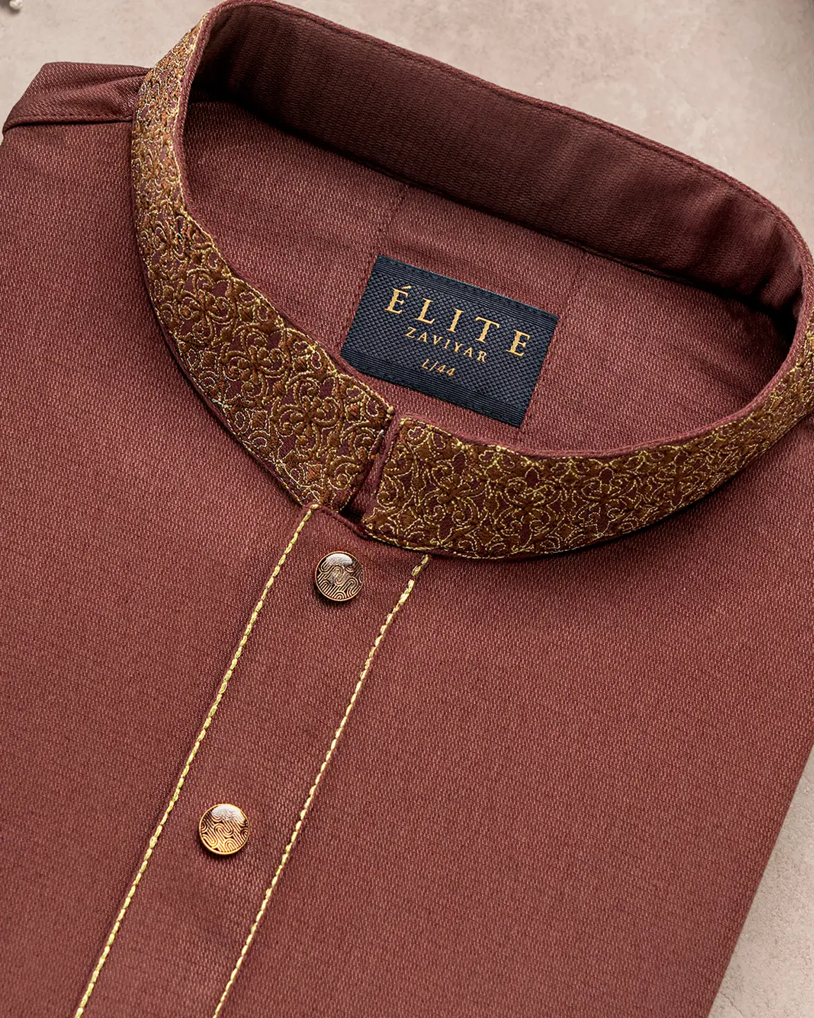 Product Description : Men’s Jacquard Cotton regular fit panjabi For Eid. Band Collar. Collar band & sleeve has embroidery details. Decorative metal show button, long Sleeve, straight hem.
