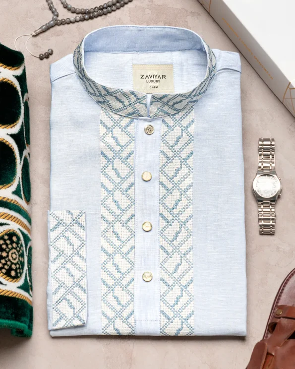 Product Description : Men’s Luxury Linen regular fit Panjabi For Eid. Band Collar. Collar band & sleeve has embroidery details. Decorative metal show button, long Sleeve, straight hem.