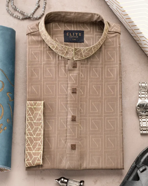 Product Description : Men’s Bamboo Silk regular fit Panjabi For Eid. Band Collar. Collar band, Body & sleeve has embroidery details. Decorative metal show button, long Sleeve, straight hem.