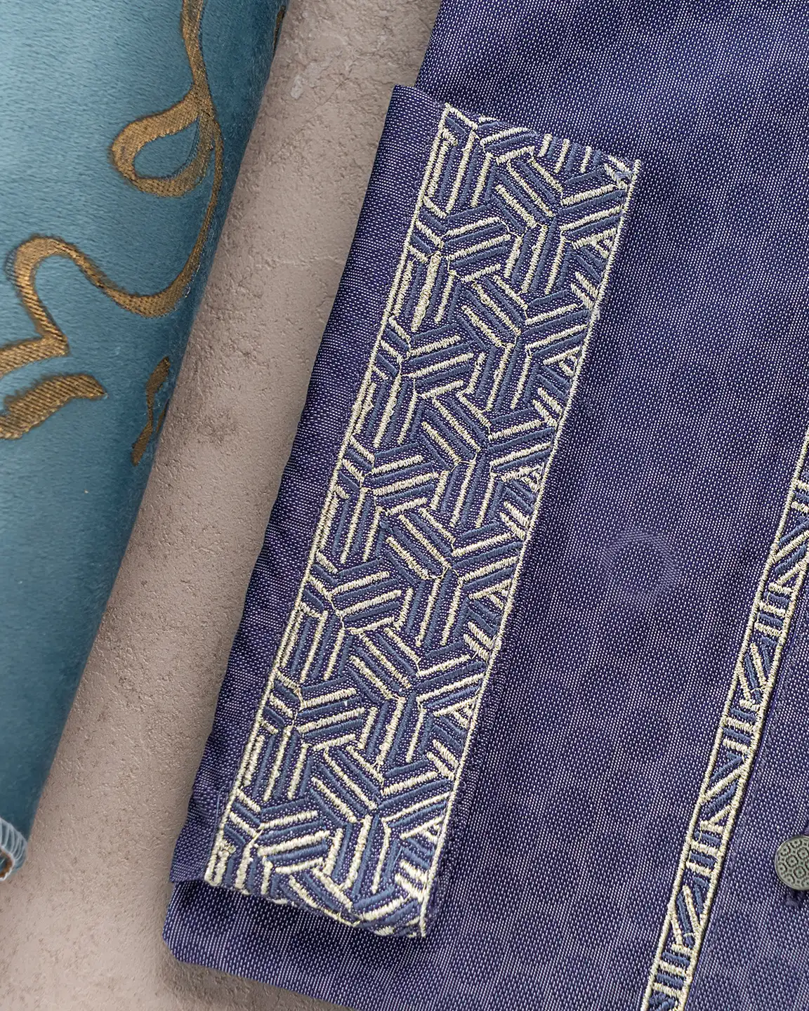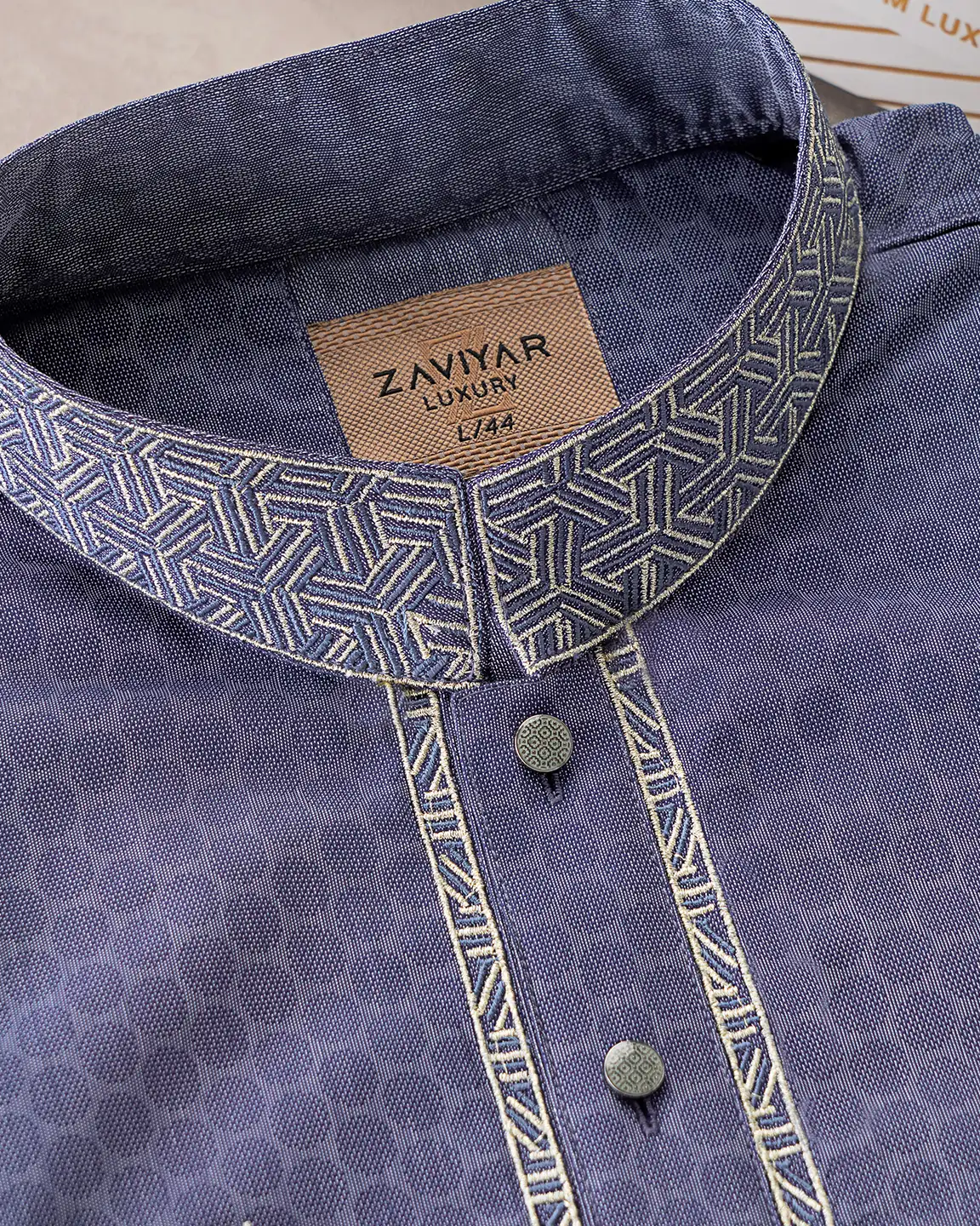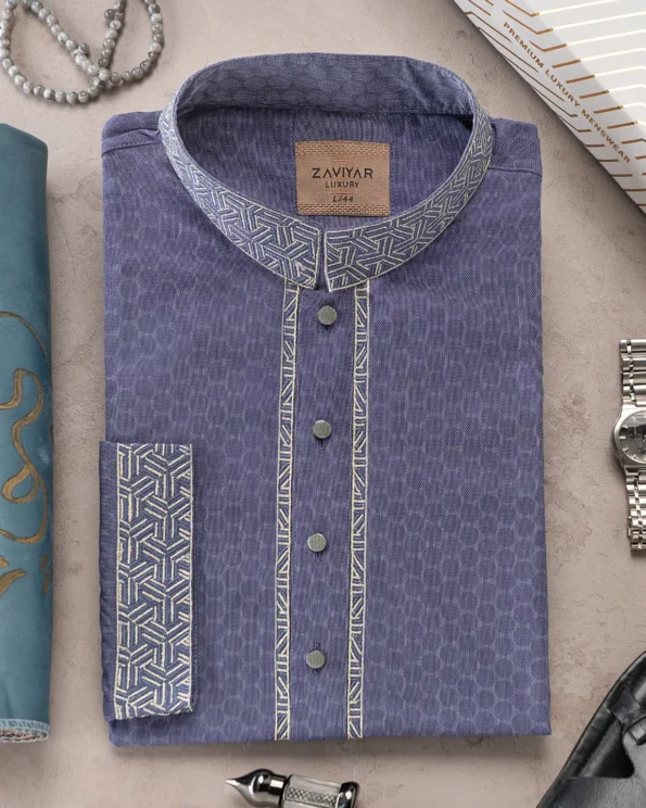 Product Description : Men’s regular fit panjabi with embroidered band collar. The front placket is lined with delicate embroidery and finished with decorative metal buttons. Matching cuffs with embroidery and button detailing. Crafted with jacquard cotton fabric.