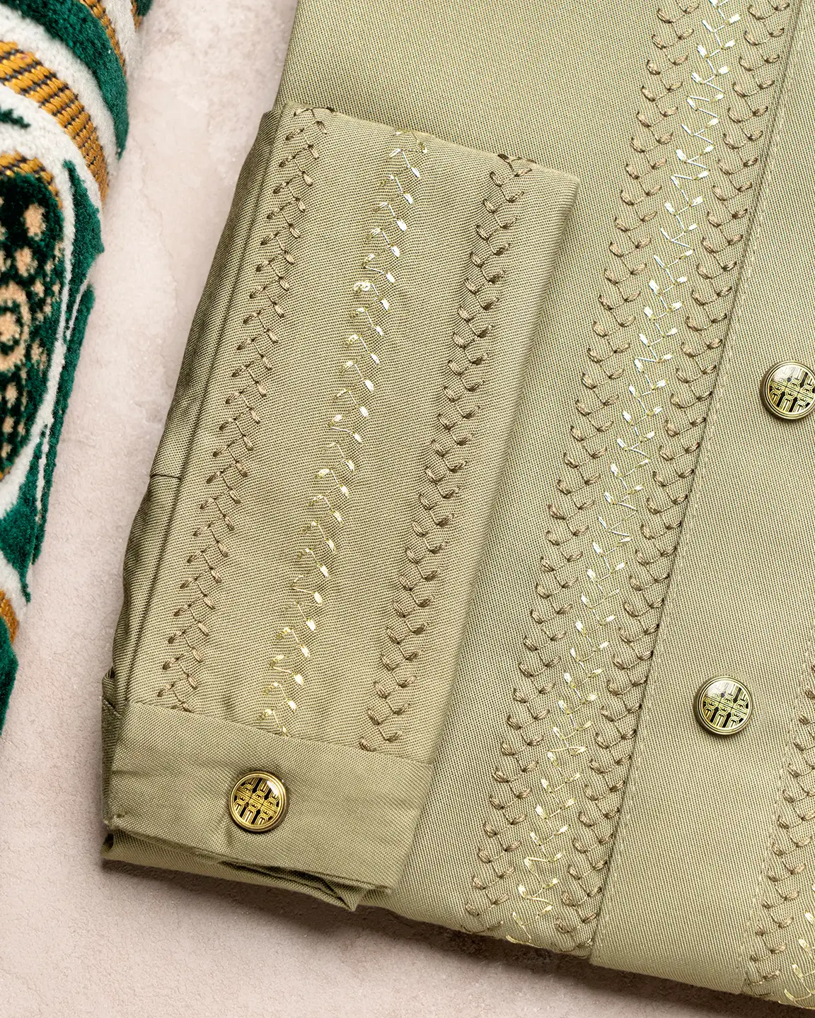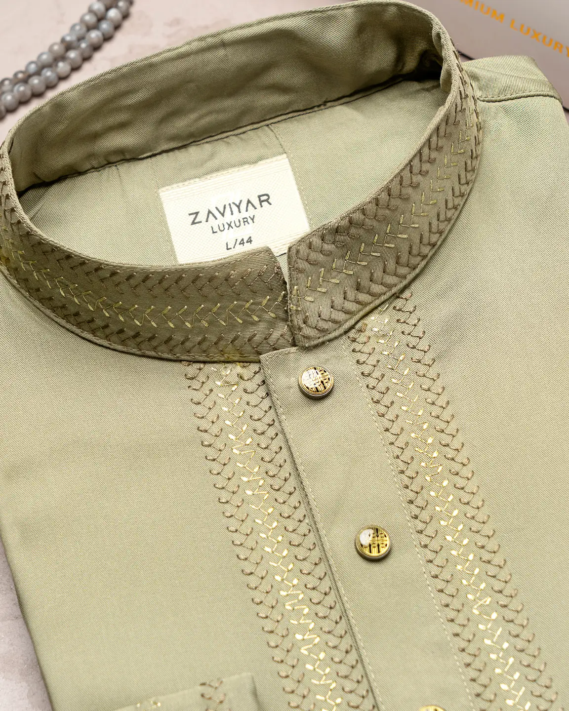 Product Description : Men’s Viscose regular fit Panjabi For Eid. Band Collar. Collar band & sleeve has embroidery details. Decorative metal show button, long Sleeve, straight hem.