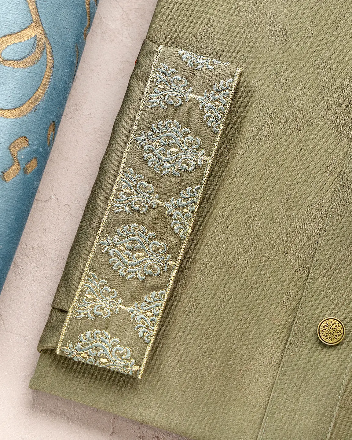 Product Description : Men’s Bamboo Cotton regular fit Panjabi For Eid. Band Collar. Collar band, Body & sleeve has embroidery details. Decorative metal show button, long Sleeve, straight hem.