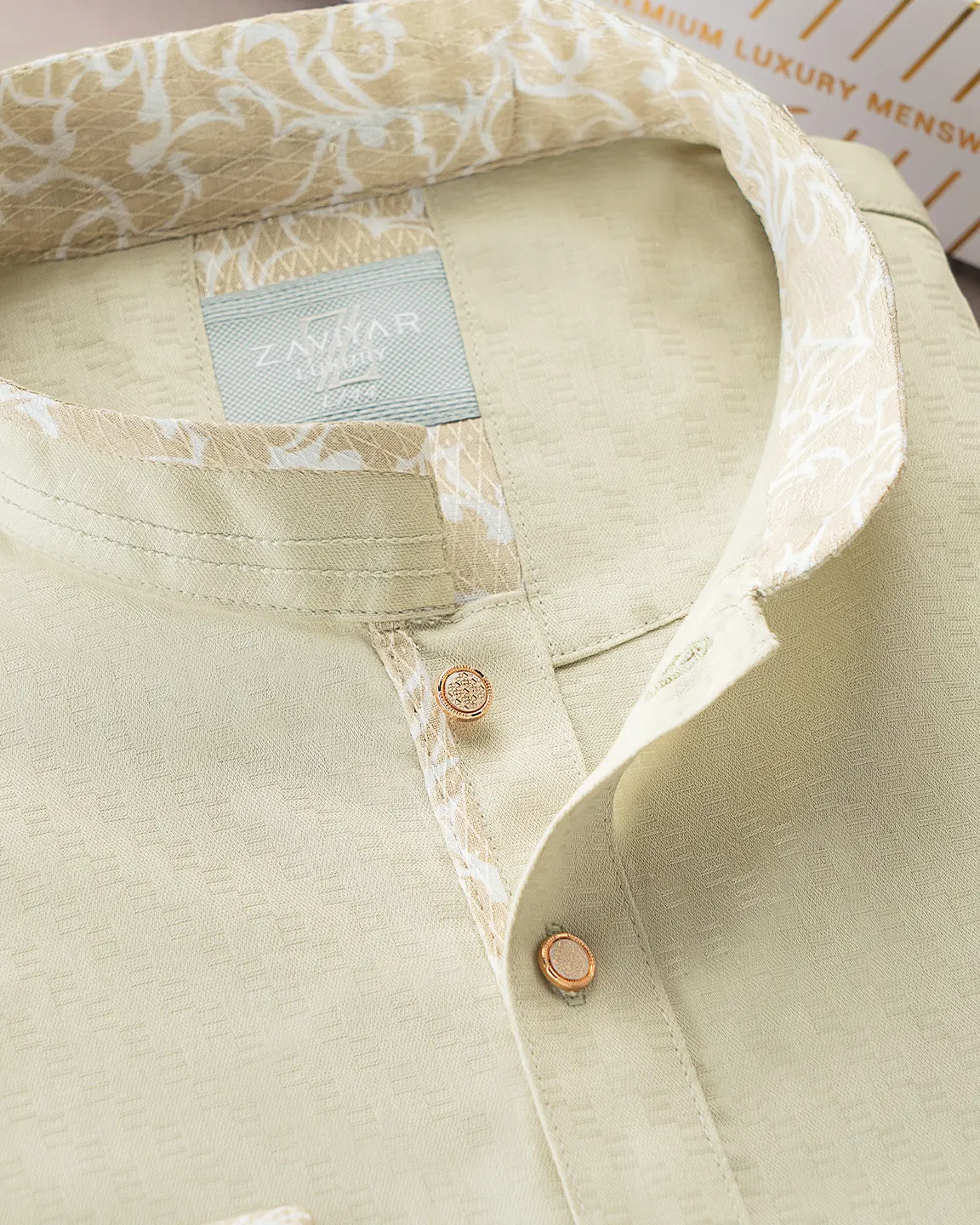 Product Description : Men’s regular fit panjabi with a premium band collar. The front placket is neatly detailed and finished with decorative metal buttons. Matching cuffs with refined trimming for a clean, coordinated look.