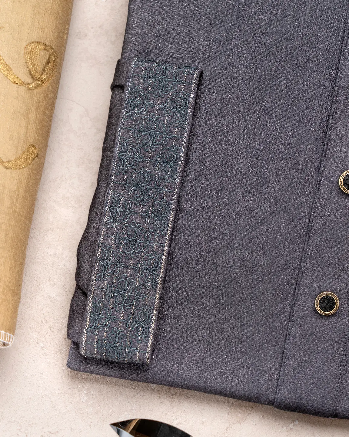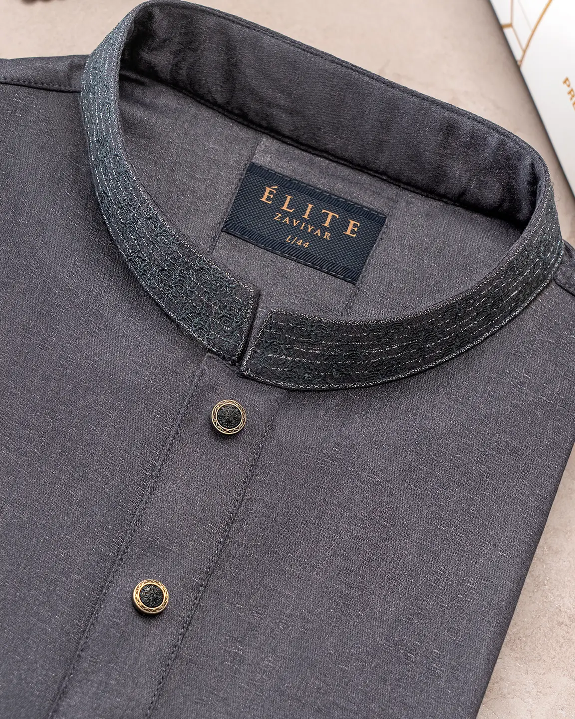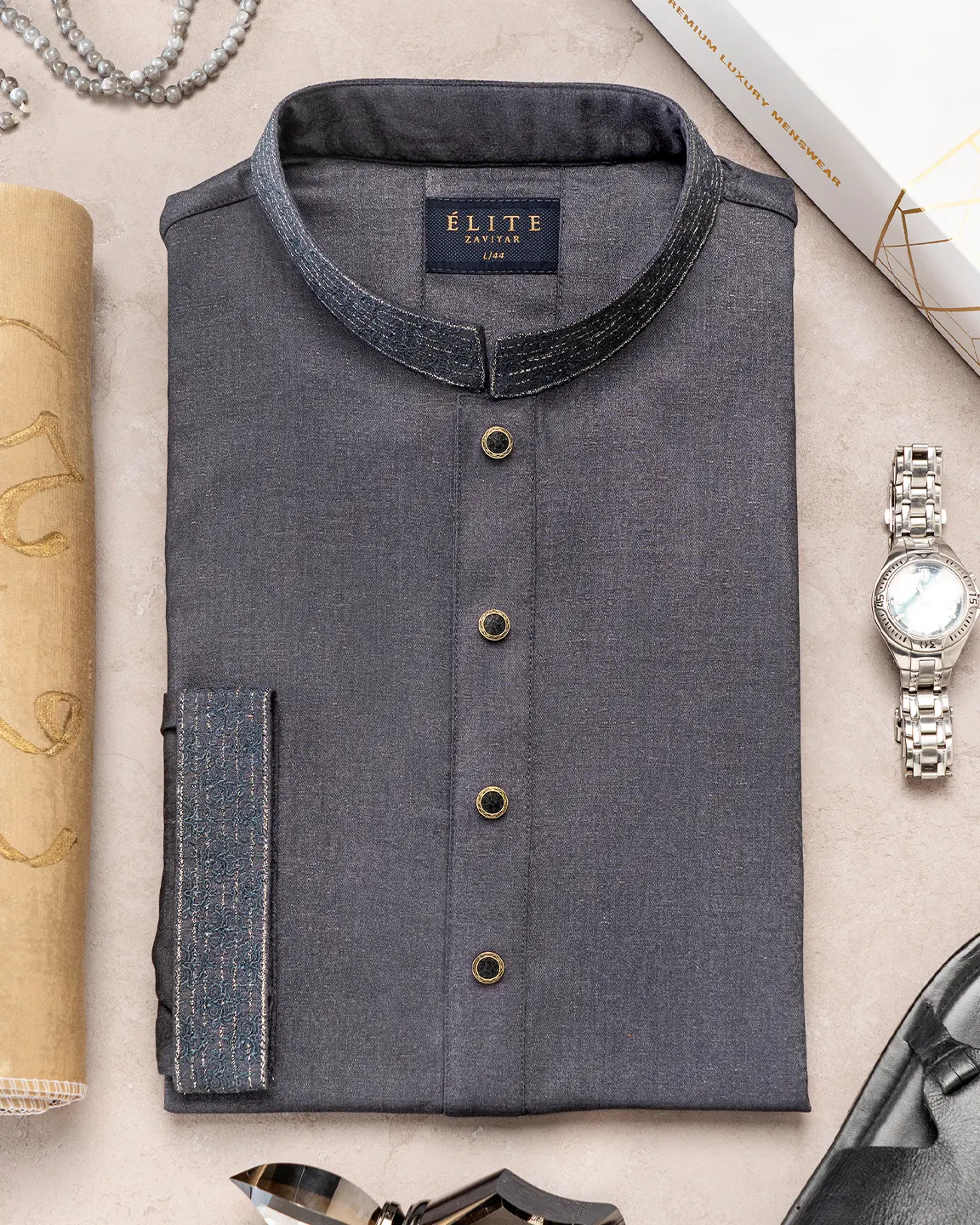 Product Description : Men’s Bamboo Silk regular fit Panjabi For Eid. Band Collar. Collar band & sleeve has embroidery details. Decorative metal show button, long Sleeve, straight hem.