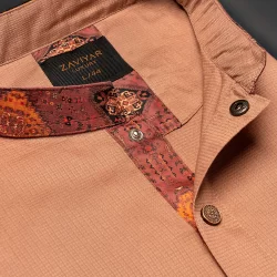 Men’s Cotton woven regular fit panjabi. Band Collar. Collar band, Body around the button plackets & sleeve hem embroidery. Decorative metal show button, long Sleeve, straight hem.