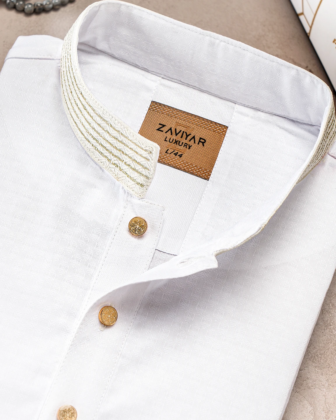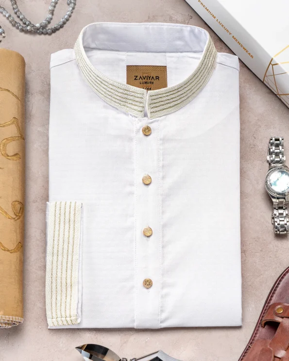 Product Description : Men’s Jacquard Cotton regular fit Panjabi For Eid. Band Collar. Collar band & sleeve has embroidery details. Decorative metal show button, long Sleeve, straight hem.
